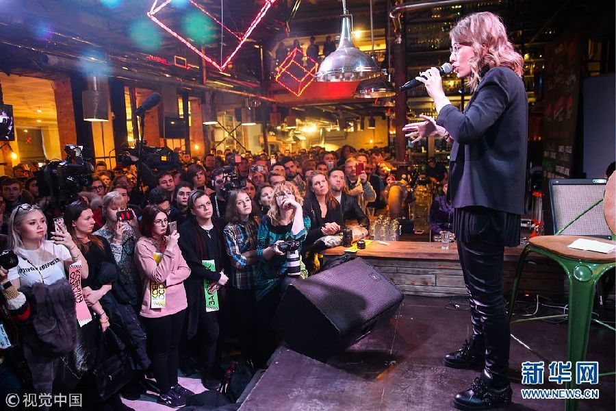 當(dāng)?shù)貢r(shí)間2月3日,俄羅斯圣彼得堡,俄羅斯電視節(jié)目主持人、總統(tǒng)候選人克謝尼婭·索布恰克會(huì)見支持者。(圖片來源:視覺中國(guó))