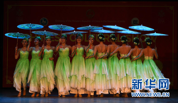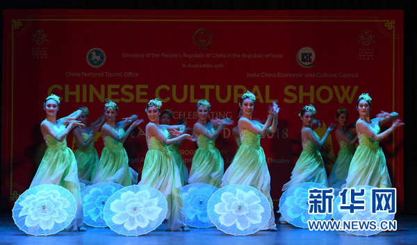 2月9日,在印度首都新德里,2018“歡樂春節(jié)”活動演出現(xiàn)場,中國演員在表演舞蹈。新華網(wǎng)發(fā)(張迺杰攝)