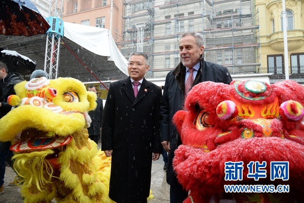 2月12日,中國駐克羅地亞大使胡兆明(左)與克首都薩格勒布市長米蘭·班迪奇在薩格勒布出席為慶祝中國春節(jié)舉辦的舞獅表演活動。新華網(wǎng)發(fā)(高磊攝)
