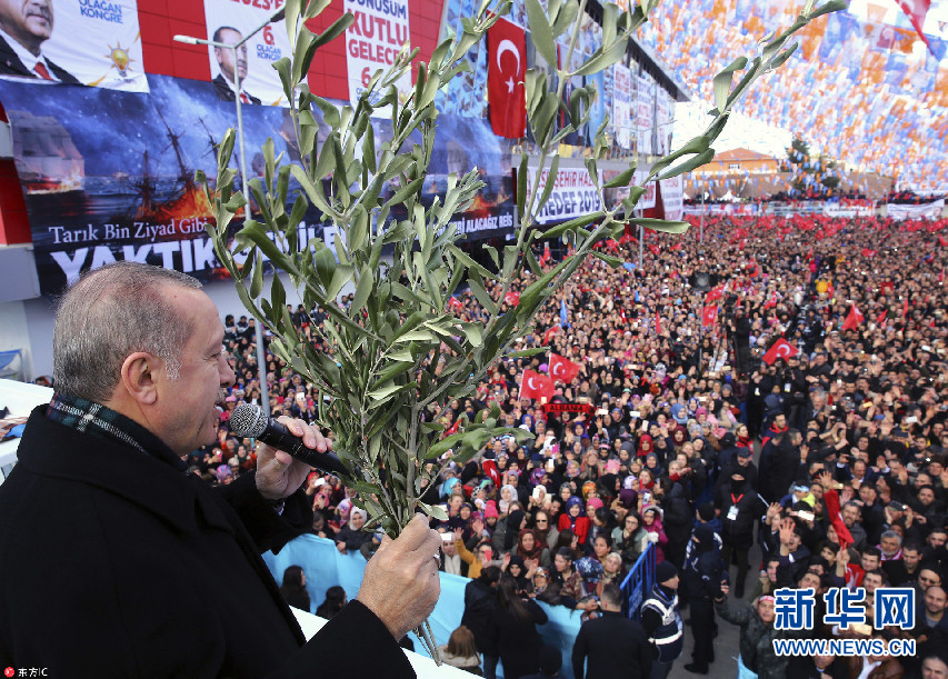 土耳其總統(tǒng)埃爾多安出席集會(huì) 手持橄欖枝發(fā)表講話