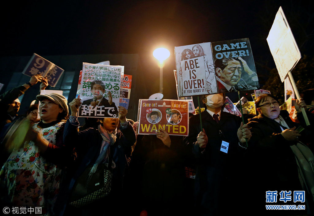 3月12日,日本東京,日本民眾在首相府邸前游行抗議。安倍晉三此前就森友學(xué)園丑聞事件的文件被篡改一事道歉。(圖片來源:視覺中國)