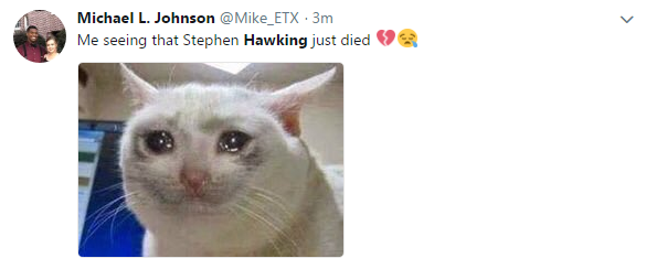 有網(wǎng)友在社交媒體平臺推特發(fā)文“剛剛看到霍金去世的消息”,并配上了哭泣的圖片?!?/p>