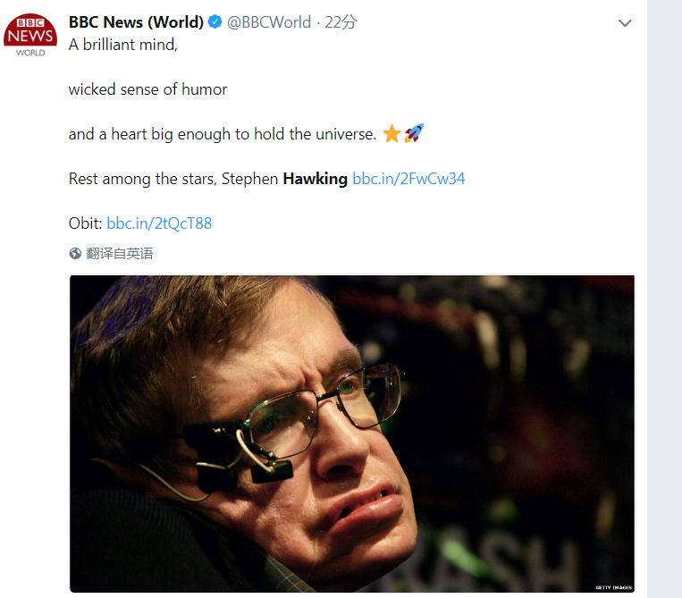 英國廣播公司(BBC)表示,一個聰明的頭腦,有點“惡趣味”,一個足矣容納宇宙的心臟。在星辰中安息吧,霍金。