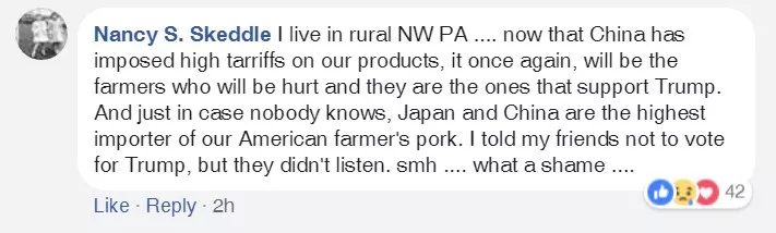 我住在賓州西北部農(nóng)村…中國(guó)已對(duì)我們的產(chǎn)品加征關(guān)稅,曾支持特朗普的農(nóng)民會(huì)再次受傷……我告訴過(guò)我的朋友不要給特朗普投票,但他們不聽。哎,太無(wú)語(yǔ)了……