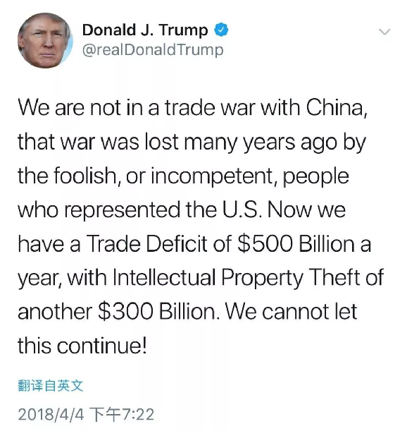 “我們沒(méi)有和中國(guó)打貿(mào)易戰(zhàn),這場(chǎng)戰(zhàn)爭(zhēng)多年前就被當(dāng)時(shí)代表美國(guó)的那些愚蠢無(wú)能的人打輸了。現(xiàn)在我們一年有5000億美元的貿(mào)易逆差,另有3000億美元知識(shí)產(chǎn)權(quán)被竊。我們不能讓這一切繼續(xù)!”