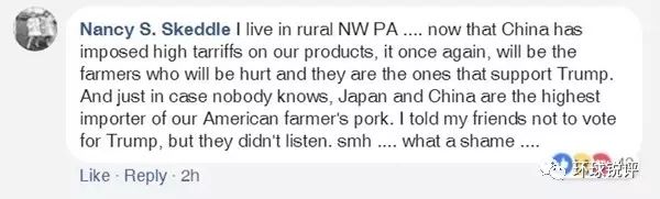 ?。ň幷咦ⅲ何易≡谫e州西北部農(nóng)村…中國(guó)準(zhǔn)備對(duì)我們的產(chǎn)品加征關(guān)稅,曾支持特朗普的農(nóng)民會(huì)再次受傷……我告訴過(guò)我的朋友不要給特朗普投票,但他們不聽。哎,太無(wú)語(yǔ)了……)