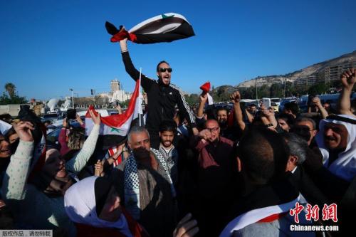 當(dāng)?shù)貢r(shí)間4月14日,敘利亞首都大馬士革民眾在街頭發(fā)起示威游行,抗議美國聯(lián)合英法兩國對(duì)首都大馬士革發(fā)起空襲行動(dòng)。