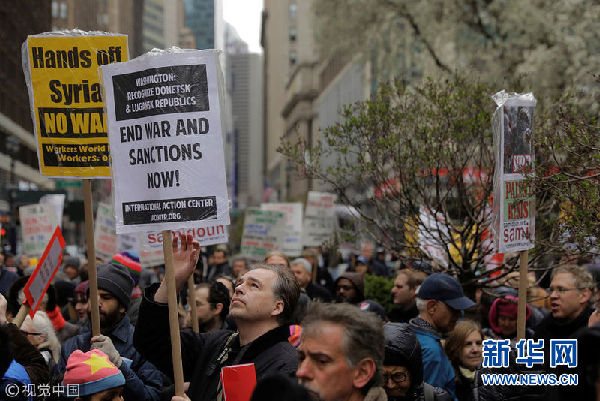 4月15日,美國(guó)紐約,民眾舉行反戰(zhàn)游行,抗議美英法聯(lián)軍襲擊敘利亞。2018-04-16 07:48:32