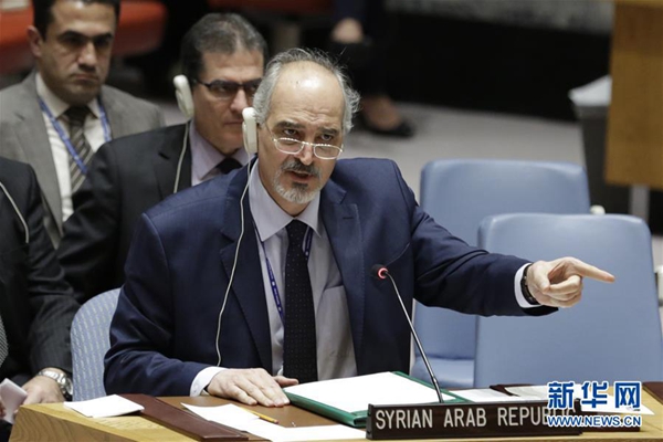 資料圖:2月24日,在位于紐約的聯(lián)合國(guó)總部,敘利亞常駐聯(lián)合國(guó)代表賈法里(前)在安理會(huì)通過(guò)敘利亞全境?;饹Q議草案后發(fā)言。新華網(wǎng)記者 李木子 攝