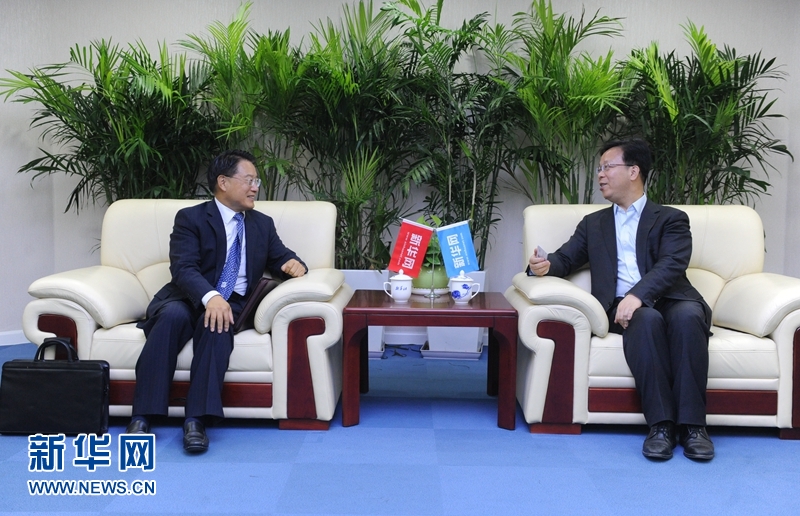 4月24日,聯(lián)合國工業(yè)發(fā)展組織總干事李勇(左)在北京接受了新華網獨家專訪。圖為新華網黨委常委、副總編輯劉加文在訪談前會見李勇。新華網記者 陳競超攝