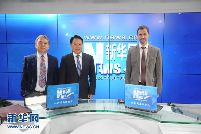 4月24日,聯(lián)合國工業(yè)發(fā)展組織總干事李勇(中)在北京接受了新華網(wǎng)獨家專訪。圖為李勇和聯(lián)合國工業(yè)發(fā)展組織副代表馬?。ㄗ螅┖吐?lián)合國工業(yè)發(fā)展組織區(qū)域首席代表(中國、朝鮮、蒙古國)包銳理(右)一行。新華網(wǎng)記者 陳競超攝