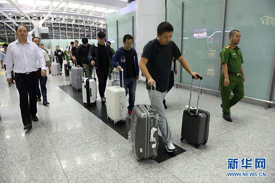 4月28日,嫌疑人在中越警方押送下進入越南河內(nèi)內(nèi)排國際機場。當日,越南警方在河內(nèi)內(nèi)排國際機場向中國警方工作組移交了許某等8名涉嫌詐騙罪的在逃嫌疑人。中國警方“獵狐行動”在越南再獲新成果。新華社記者王迪攝