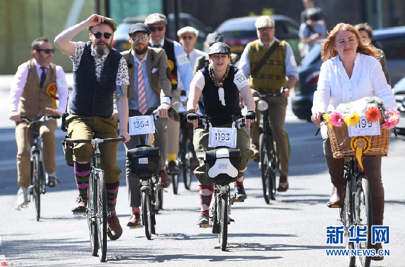 當(dāng)?shù)貢r(shí)間2018年5月5日,英國(guó)倫敦,當(dāng)?shù)嘏e辦復(fù)古騎行活動(dòng),民眾身穿花呢子服裝騎車穿行在倫敦街頭。今年是該活動(dòng)舉辦十周年。(圖片來(lái)源:東方IC)