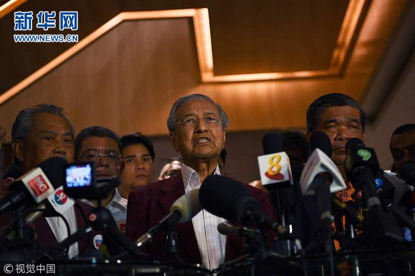 當地時間2018年5月9日,馬來西亞吉隆坡,馬哈蒂爾代表希望聯盟召開新聞發(fā)布會。9日,馬來西亞國會大選結束。10日凌晨官方點票結果顯示,前總理馬哈蒂爾(Mahathir)帶領的希望聯盟取得112席簡單多數國會議席,足以籌組政府及勝出大選,并終結執(zhí)政國民陣線長達60年的管治?,F總理納吉布領導的國民陣線僅獲得76席。(圖片來源:視覺中國)