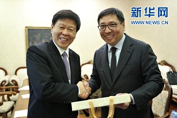 5月14日,在阿斯塔納,中國國家稅務(wù)總局局長王軍(左邊)在會議開始前與哈薩克斯坦副總理多薩耶夫舉行會晤。新華網(wǎng)發(fā) 阿比洛夫攝