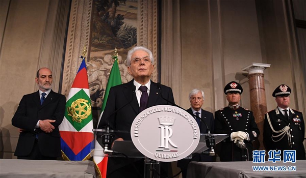 5月27日,在意大利首都羅馬,意總統(tǒng)馬塔雷拉發(fā)表講話。據(jù)當(dāng)?shù)孛襟w報(bào)道,意大利新任總理孔特27日晚間與總統(tǒng)馬塔雷拉會(huì)面并提交擬定的內(nèi)閣成員名單時(shí),馬塔雷拉否決了由意大利聯(lián)盟黨和五星運(yùn)動(dòng)力推的持疑歐立場(chǎng)的經(jīng)濟(jì)學(xué)家保羅·薩沃納出任財(cái)政部長(zhǎng)??滋叵蚩偨y(tǒng)提出放棄組閣任務(wù)請(qǐng)求,請(qǐng)求得到總統(tǒng)確認(rèn)。新華社發(fā)(阿爾貝托·林格里亞攝)