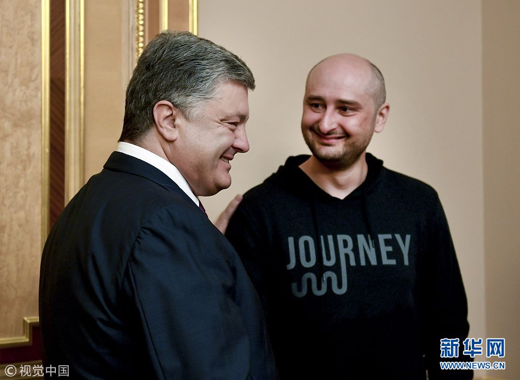 5月30日,烏克蘭基輔,烏克蘭總統(tǒng)波羅申科會見此前被報道“死亡”的俄羅斯記者巴布琴科。(圖片來源:視覺中國)