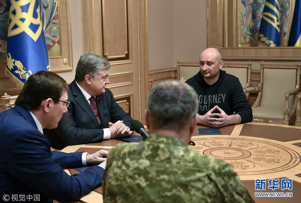 5月30日,烏克蘭基輔,烏克蘭總統(tǒng)波羅申科會(huì)見此前被報(bào)道“死亡”的俄羅斯記者巴布琴科。(圖片來源:視覺中國)