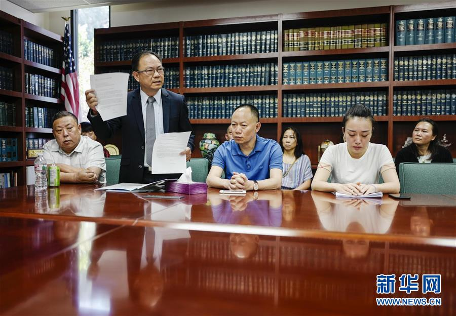 6月8日,在美國洛杉磯,江玥的家人和律師與媒體見面。新華社發(fā)(趙漢榮攝)