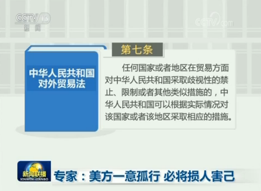 專家表示,中方采取的反制措施合理合法。根據(jù)《中華人民共和國(guó)對(duì)外貿(mào)易法》第七條,任何國(guó)家或者地區(qū)在貿(mào)易方面對(duì)中華人民共和國(guó)采取歧視性的禁止、限制或者其他類似措施的,中華人民共和國(guó)可以根據(jù)實(shí)際情況對(duì)該國(guó)家或者該地區(qū)采取相應(yīng)的措施。