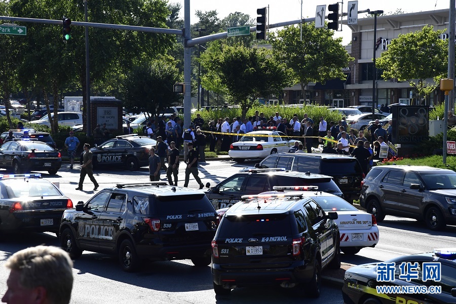 6月28日,在美國馬里蘭州首府安納波利斯,警方封鎖槍擊事件現(xiàn)場(chǎng)。馬里蘭州一家報(bào)紙的編輯室當(dāng)日下午發(fā)生槍擊事件。當(dāng)?shù)鼐秸f,槍擊事件已造成5人死亡,另有多人受傷。 新華社記者楊承霖?cái)z