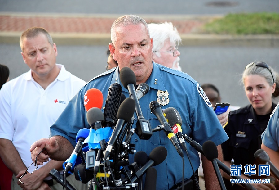 6月28日,在美國馬里蘭州首府安納波利斯市,警方負(fù)責(zé)人威廉·克蘭普夫在新聞發(fā)布會(huì)上回答記者提問。美國馬里蘭州首府安納波利斯市《首都新聞報(bào)》報(bào)社28日下午發(fā)生槍擊事件。當(dāng)?shù)鼐截?fù)責(zé)人確認(rèn),槍擊已造成5人死亡,另有多人受傷。新華社記者楊承霖?cái)z
