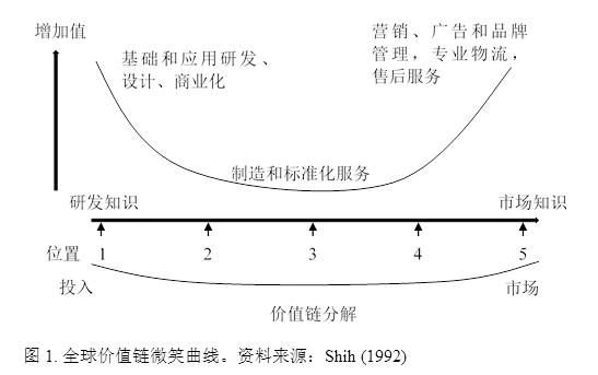 全球價值鏈構(gòu)建了一個跨國或者跨地區(qū)不同公司實現(xiàn)不同的工序和商業(yè)功能的生產(chǎn)架構(gòu)(Grossman和Rossi-Hansberg,2012)。這個架構(gòu)是“生產(chǎn)性的(價值增長的)通向并且支持最終使用的順序” (Sturgeon 2001)。微笑曲線提出了一種不同的解構(gòu)國際貿(mào)易的方法。有些國家專業(yè)化“生產(chǎn)”知識與研發(fā),而另一些國家專業(yè)化于制造業(yè),或者品牌營銷。因此,一個產(chǎn)品的增加值不再是完全屬于某一個國家,而是整條價值鏈上的參與者都可以分一杯羹。在為最終產(chǎn)品貢獻(xiàn)價值的生產(chǎn)工序的鏈條上(既,產(chǎn)品的價值鏈),一般的工序鏈條開始于基礎(chǔ)和應(yīng)用研究與設(shè)計。這些研究與設(shè)計活動往往會帶來新的想法、技術(shù)、新產(chǎn)品設(shè)計和新的生產(chǎn)工藝。這個工序鏈條下一環(huán)節(jié)是商業(yè)化這些研究成果,如專利和知識產(chǎn)權(quán)(想法、論文、知識等);再下一環(huán)節(jié)是資源的獲取和材料的生產(chǎn)(包括農(nóng)業(yè)產(chǎn)品),零部件的生產(chǎn)和產(chǎn)品的組裝,以及最后環(huán)節(jié)的營銷、廣告、品牌管理、物流、商業(yè)服務(wù)和售后服務(wù)。另外,價值鏈在文獻(xiàn)中的定義是超出中間品貿(mào)易的,它強調(diào)在不同環(huán)節(jié)上領(lǐng)先企業(yè)與供應(yīng)商之間的權(quán)力架構(gòu) (Milberg,2004)。