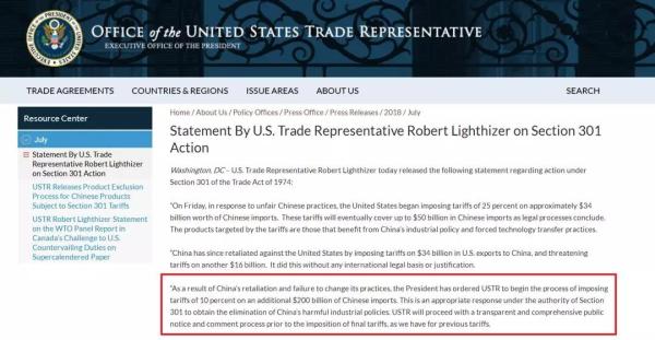 第二,強(qiáng)調(diào)中國(guó)不聽勸,未按其要求“限期整改”——聲明稱,過(guò)去一年,特朗普政府“耐心”敦促中國(guó)停止原有做法、開放市場(chǎng)、參與真正的市場(chǎng)競(jìng)爭(zhēng),并給出了“清晰和詳細(xì)”的具體改變要求,但中國(guó)“并未改變令美國(guó)經(jīng)濟(jì)未來(lái)處于風(fēng)險(xiǎn)的行為”,反而開始報(bào)復(fù)美國(guó)產(chǎn)品,這樣做“缺乏任何國(guó)際法理基礎(chǔ)或理由”。所以他們覺(jué)得,原有的力度不夠了,要再加加碼,“這是美國(guó)在301條款授權(quán)下對(duì)消除中國(guó)‘有害’產(chǎn)業(yè)政策做出的合適回應(yīng)”。(就奇怪怎么這個(gè)301條款哪兒哪兒都好使?)