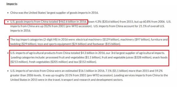 首先,從中方向美方的出口結(jié)構(gòu)來(lái)看:2016年美國(guó)從中國(guó)進(jìn)口總值4626億美元,是美國(guó)最大的商品供給方。進(jìn)口額最高的是電子機(jī)械類產(chǎn)品(1290億美元),機(jī)器(970億美元),家具及寢具(290億美元),玩具及運(yùn)動(dòng)裝備(240億美元),鞋類(150億美元)。此外,從中國(guó)進(jìn)口的農(nóng)產(chǎn)品總額43億美元(這已經(jīng)是美國(guó)第三大農(nóng)產(chǎn)品供應(yīng)方了),其中占比最高的是加工后的水果及蔬菜(11億美元),水果及蔬菜汁(3.28億美元),快餐休閑類食品(2.13億美元),新鮮蔬菜(2.05億美元)及茶葉(1.52億美元)。