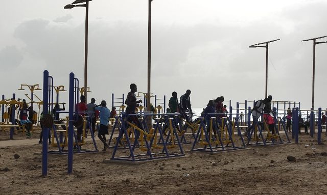 2018年7月18日,塞內(nèi)加爾首都達喀爾,當(dāng)?shù)孛癖娫跒I海大道健身公園內(nèi)鍛煉。(新華社記者賴向東攝)