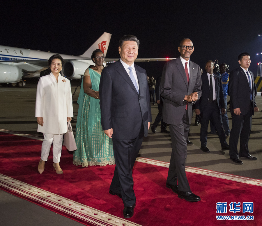 當(dāng)?shù)貢r(shí)間晚8時(shí)50分許,習(xí)近平乘坐的專機(jī)抵達(dá)基加利國際機(jī)場(chǎng)。習(xí)近平和夫人彭麗媛步出艙門,受到盧旺達(dá)總統(tǒng)卡加梅和夫人珍妮特等熱情迎接。盛裝的禮兵精神抖擻,向尊貴的客人行注目禮。盧旺達(dá)少年向習(xí)近平和彭麗媛獻(xiàn)花??用废蛄?xí)近平和彭麗媛介紹盧方其他迎接人員。身著靚麗民族服裝的當(dāng)?shù)孛癖娞饸g快的迎賓舞,敲響喜慶的非洲鼓,熱烈歡迎中國貴賓到來。