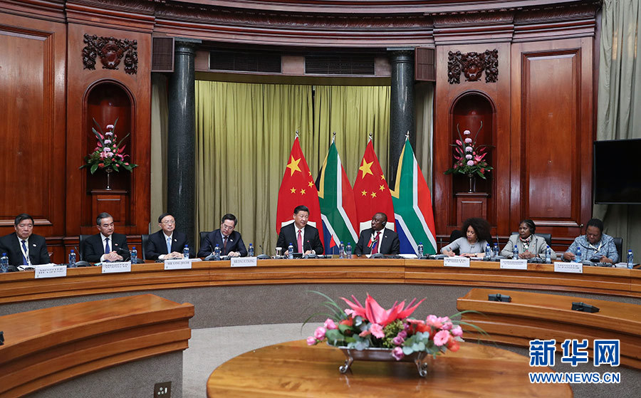 習(xí)主席對南非進(jìn)行國事訪問期間,兩國元首就推進(jìn)新時期中南全面戰(zhàn)略伙伴關(guān)系達(dá)成重要共識,一致同意加強(qiáng)高層往來,深化政治互信,對接發(fā)展戰(zhàn)略,推進(jìn)務(wù)實合作,密切人文交流,讓兩國人民更多享受中南合作成果。