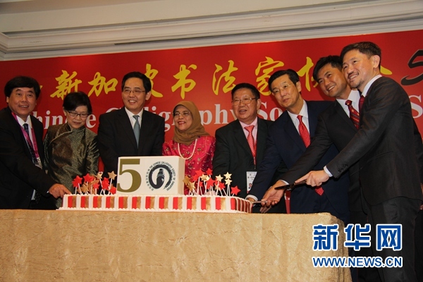 中國駐新加坡大使洪小勇(左三)、新加坡總統(tǒng)哈莉瑪·雅各布(左四)和新加坡書法家協(xié)會會長陳聲桂,在新加坡書法家協(xié)會成立50周年慶午宴上切蛋糕。記者王麗麗 攝