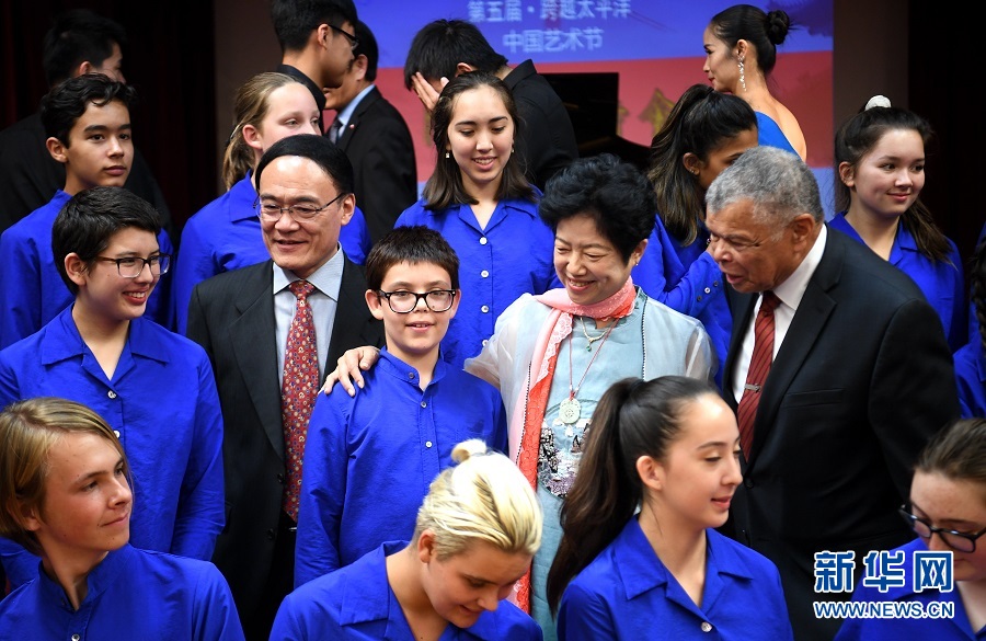 9月7日,在美國舊金山舉行的第五屆“跨越太平洋——中國藝術(shù)節(jié)”開幕式上,皮德蒙特東灣兒童合唱團成員與來賓合影。第五屆“跨越太平洋——中國藝術(shù)節(jié)”開幕式7日在中國駐舊金山總領(lǐng)事館舉行。美國民間友好團體、藝術(shù)界人士等230多人出席。 新華社記者吳曉凌攝