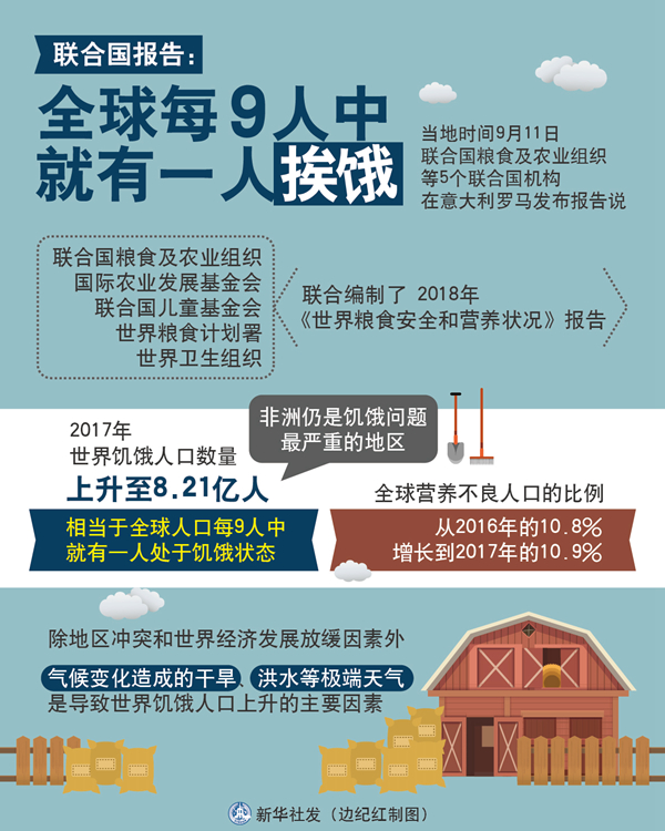 聯(lián)合國報告:全球每9人中就有一人挨餓。新華社發(fā) 邊紀(jì)紅 制圖