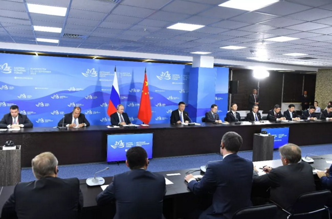 9月11日,國家主席習(xí)近平在符拉迪沃斯托克和俄羅斯總統(tǒng)普京共同出席中俄地方領(lǐng)導(dǎo)人對(duì)話會(huì)。 新華社記者 饒愛民攝