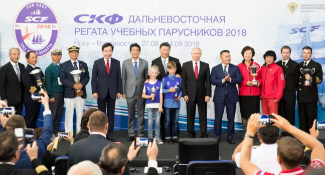 9月12日,第四屆東方經(jīng)濟(jì)論壇全會(huì)在符拉迪沃斯托克舉行。中國國家主席習(xí)近平、俄羅斯總統(tǒng)普京、蒙古國總統(tǒng)巴特圖勒嘎、日本首相安倍晉三、韓國總理李洛淵等出席。這是全會(huì)后,與會(huì)各國領(lǐng)導(dǎo)人共同出席第三屆“遠(yuǎn)東杯”國際帆船拉力賽第一賽段頒獎(jiǎng)儀式。新華社記者 黃敬文 攝