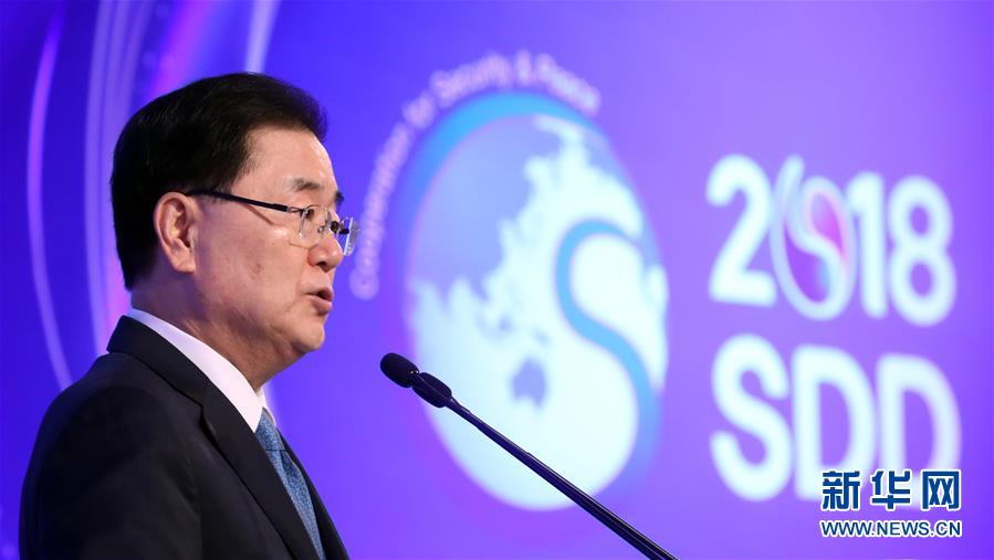 9月13日,在韓國(guó)首爾,韓國(guó)總統(tǒng)府青瓦臺(tái)國(guó)家安保室室長(zhǎng)鄭義溶在“2018年首爾安保對(duì)話(huà)”開(kāi)幕式上致辭。韓國(guó)總統(tǒng)府青瓦臺(tái)國(guó)家安保室室長(zhǎng)鄭義溶13日表示,為從根本上消除可能導(dǎo)致韓朝雙方軍事沖突的危險(xiǎn)因素,提升軍事互信水平,韓朝正就在軍事領(lǐng)域開(kāi)展廣泛合作進(jìn)行協(xié)商并制定方案。 新華社/紐西斯通訊社