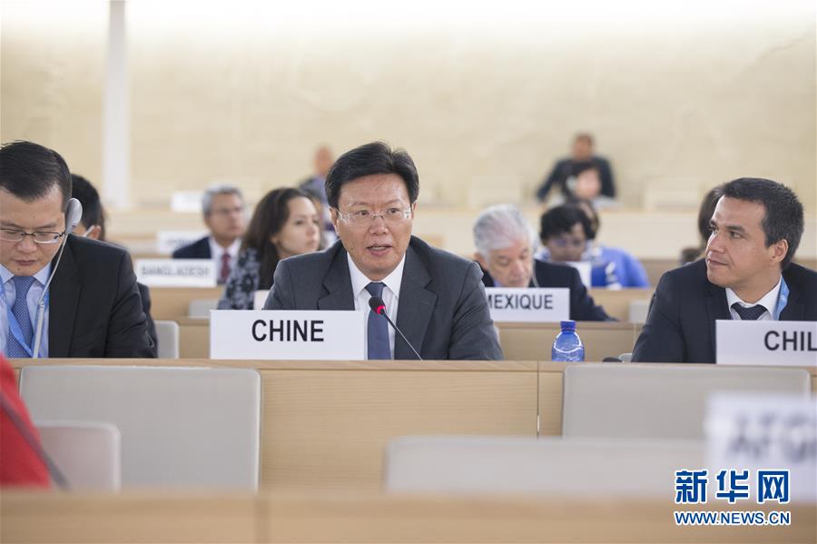9月14日,在瑞士日內(nèi)瓦,中國(guó)常駐聯(lián)合國(guó)日內(nèi)瓦辦事處和瑞士其他國(guó)際組織代表俞建華(中)在會(huì)上發(fā)表聯(lián)合聲明。當(dāng)日,聯(lián)合國(guó)人權(quán)理事會(huì)第39次會(huì)議在日內(nèi)瓦萬(wàn)國(guó)宮開幕。中國(guó)代表近140個(gè)國(guó)家呼吁攜手合作消除貧困、更好促進(jìn)和保護(hù)人權(quán),表達(dá)了廣大發(fā)展中國(guó)家的心聲,得到發(fā)展中國(guó)家熱烈響應(yīng)。新華社記者徐金泉攝