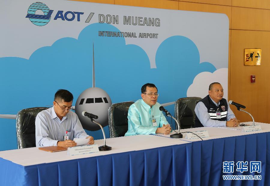 9月29日,在泰國(guó)曼谷廊曼機(jī)場(chǎng),機(jī)場(chǎng)管理局局長(zhǎng)素提拉瓦(中)在發(fā)布會(huì)上發(fā)言。 新華社記者張可任攝