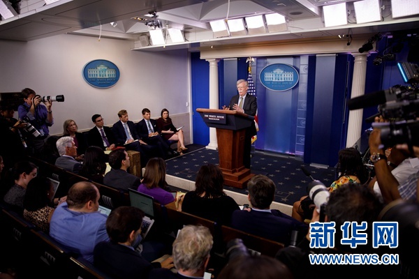 10月3日,在美國首都華盛頓,美國總統(tǒng)國家安全事務助理博爾頓出席記者會。 新華社發(fā)(沈霆攝)