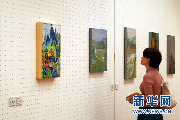 10月8日,在日本東京世田谷美術(shù)館,一位觀眾欣賞展出的中國(guó)藝術(shù)家畫(huà)作。 新華社記者王可佳攝