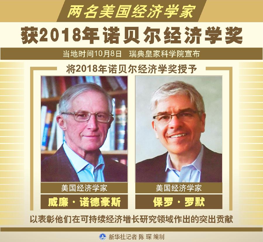 新華社斯德哥爾摩10月8日電(記者和苗 付一鳴)瑞典皇家科學(xué)院8日宣布,將2018年諾貝爾經(jīng)濟(jì)學(xué)獎授予美國經(jīng)濟(jì)學(xué)家威廉·諾德豪斯和保羅·羅默,以表彰他們在可持續(xù)經(jīng)濟(jì)增長研究領(lǐng)域作出的突出貢獻(xiàn)。