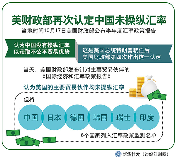 新華社華盛頓10月17日電(記者楊承霖 高攀)美國財政部17日公布半年度匯率政策報告,認為中國沒有操縱匯率以獲取不公平貿(mào)易優(yōu)勢。這是美國總統(tǒng)特朗普就任后,美國財政部第四次作出這一認定。