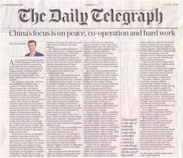 英國(guó)時(shí)間10月19日,英國(guó)主流大報(bào)《每日電訊報(bào)》紙質(zhì)版和網(wǎng)絡(luò)版同時(shí)刊登我駐英國(guó)大使劉曉明題為《中國(guó)致力于和平、合作與奮斗》的署名文章。全文如下: