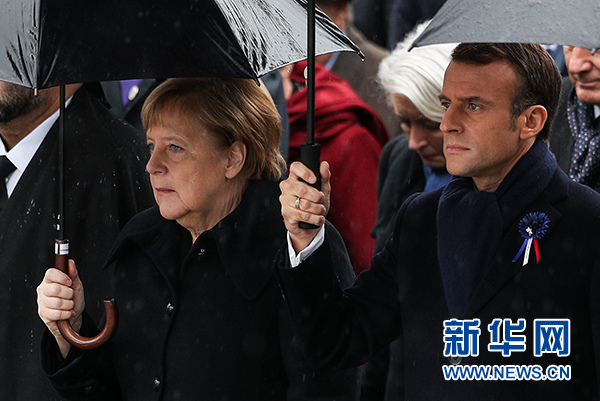 11月11日,法國(guó)總統(tǒng)馬克龍(右)與德國(guó)總理默克爾從法國(guó)巴黎的香榭麗舍大街走向凱旋門,參加一戰(zhàn)結(jié)束百年紀(jì)念儀式。新華社記者 鄭煥松 攝