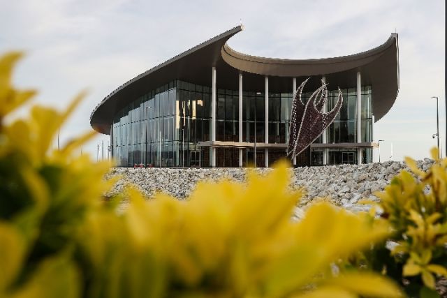 APEC大廈坐落于海濱,是此次APEC會(huì)議場(chǎng)館之一。主建筑造型像是巴新土著居民特有的傳統(tǒng)木舟。昔日,土著居民正是駕著這種木舟乘風(fēng)破浪,開(kāi)啟周邊貿(mào)易。正門前,12米高的金屬雕塑像木舟極具辨識(shí)度的雙帆,又形似巴新國(guó)鳥(niǎo)天堂鳥(niǎo)雙翼展向空中,澳大利亞設(shè)計(jì)師以此寓意“為開(kāi)啟繁榮貿(mào)易之旅揚(yáng)帆”。