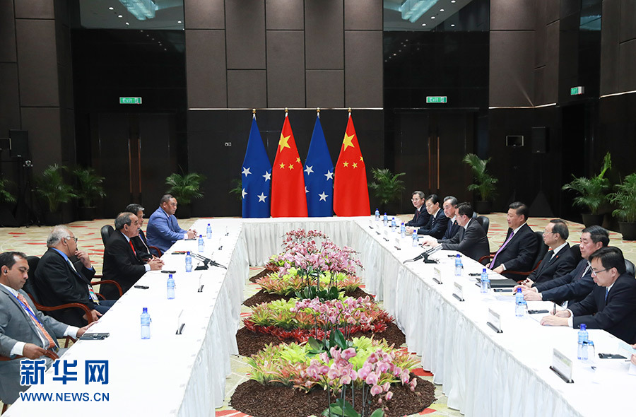 11月16日,國家主席習(xí)近平在莫爾茲比港分別會見建交太平洋島國領(lǐng)導(dǎo)人。這是習(xí)近平會見密克羅尼西亞聯(lián)邦總統(tǒng)克里斯琴。 新華社記者 謝環(huán)馳 攝