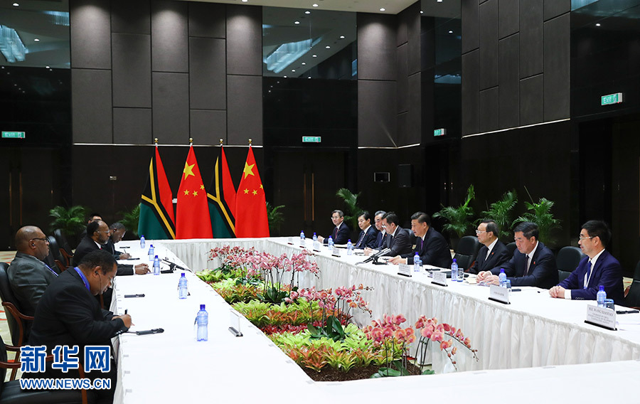 11月16日,國家主席習(xí)近平在莫爾茲比港分別會見建交太平洋島國領(lǐng)導(dǎo)人。這是習(xí)近平會見瓦努阿圖總理薩爾瓦伊。 新華社記者 謝環(huán)馳 攝