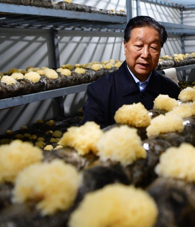 福建農(nóng)林大學(xué)研究員林占熺在查看利用巨菌草碎渣來(lái)培育的銀耳。新華社記者 魏培全 攝